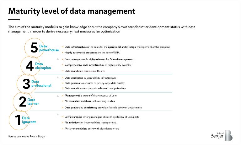 To figure out how to reach your destination, you first need to know where you're starting from – this very much applies to data management in retail. The first step is therefore to determine the level of maturity of data management within your company. In categorizing it, you need to look at whether or not the indispensable awareness of data's relevance is present at management level, while also considering criteria such as the extent and quality of the existing infrastructure and processes, as well as how data is used in day-to-day business and whether it is applied for the evolution of the business model, and so on (see infographic).