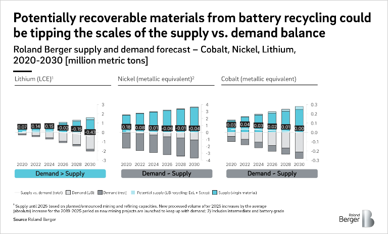 There are numerous reasons to expand and improve the recycling infrastructure for EV batteries. Before we get to sustainability, there is the straightforward factor of supply and demand. The potentially recoverable materials from EV batteries may only play a minor role compared to the overall supply, but they could be vital in ensuring supply is able to meet demand. This will be particularly true for lithium and cobalt toward the end of the decade.
