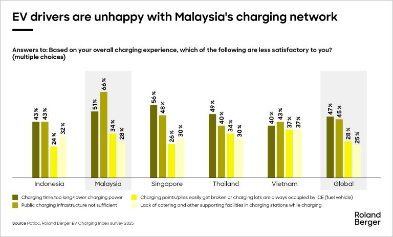 Our survey suggests Malaysia’s EV drivers feel there is plenty of room for improvement in the charging experience. Half of respondents said charging takes too long, while two-thirds described the country’s charging infrastructure as insufficient, which is significantly higher than in other Southeast Asian countries.