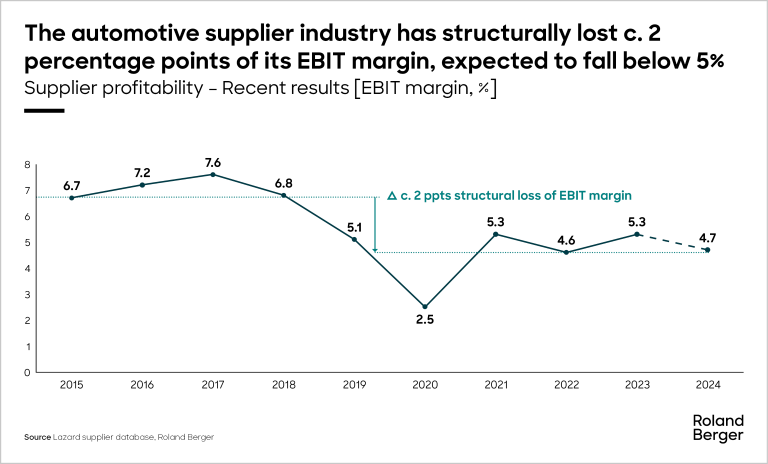 It’s not just top-line pressures—profitability is eroding across the board. OEM EBIT margins are slipping. Supplier margins have fallen more than 2 percentage points since 2017. And rising R&D costs are squeezing budgets even further.