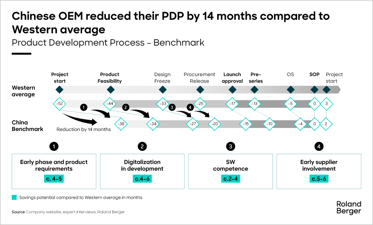 Many Chinese OEMs are already proving what streamlined engineering can deliver. In benchmarking studies, they show up to a 14-month advantage in end-to-end product development process.