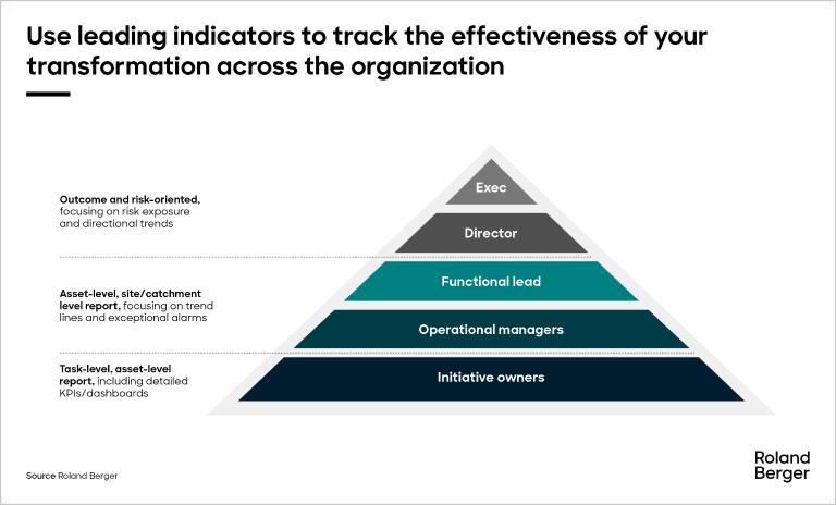 Many programs also fail because they track outcomes that are lagging in performance rather than leading indicators of improvement. Effective transformation requires a measurement pyramid that provides line of sight from the boardroom to the boots on the ground