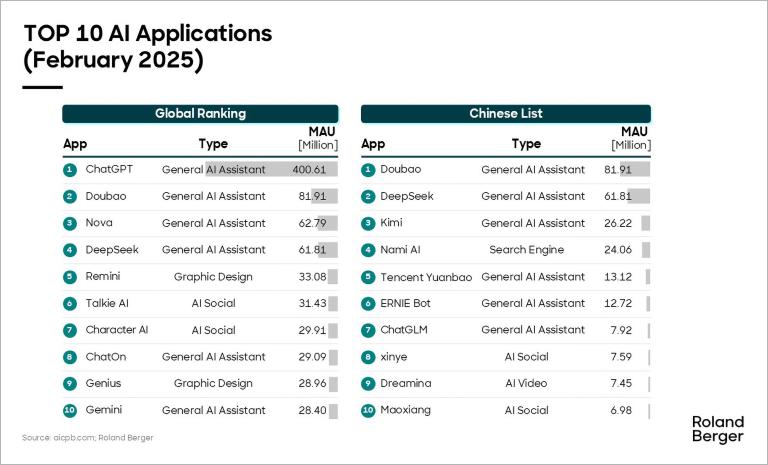 According to China's Top 10 AI applications ranking, general AI assistants Doubao and DeepSeek have emerged as dominant portals. As of February, the gap in monthly active users (MAU) between Doubao, DeepSeek, and the third-ranked Kimi widened to 36 million. Some new entrants, such as Tencent Yuanbao, have achieved rapid growth by integrating DeepSeek's model, delivering a smooth user experience, and leveraging aggressive marketing strategies. In contrast, established AI assistants like Wen Xiaoyan, Zhipu Qingyan, and iFlytek Spark are facing the challenge of stagnation due to slower growth, where failing to advance means falling behind.
