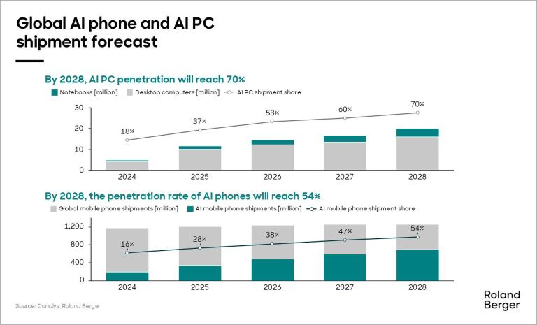 The fusion of AI and hardware goes beyond simply embedding large models into existing devices. Instead, it involves a paradigm shift in human-computer interaction, where system-level AI drives terminals to evolve from passive execution to active cognition. Two key categories leading this transformation are AI smartphones and AI PCs. By 2028, global AI PC shipments are projected to reach a 70% penetration rate, while AI smartphones are expected to hit 54%.