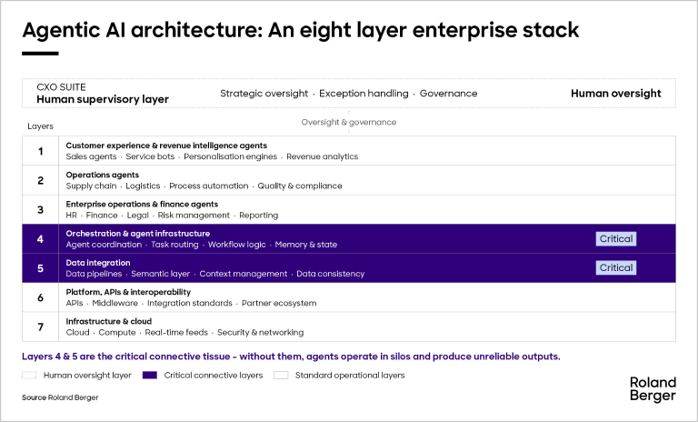The eight-layer agentic operating model. The orchestration and semantic layers are non-negotiable foundations — without them, agents operate in silos and produce inconsistent, unreliable outputs.
