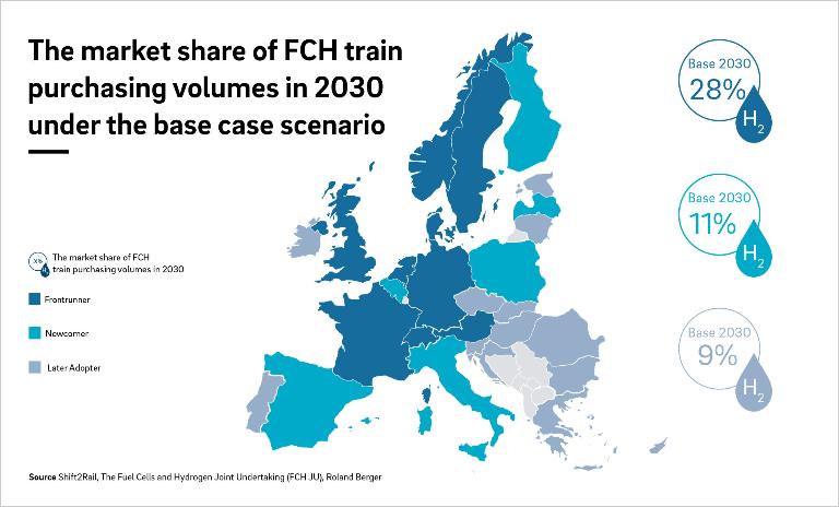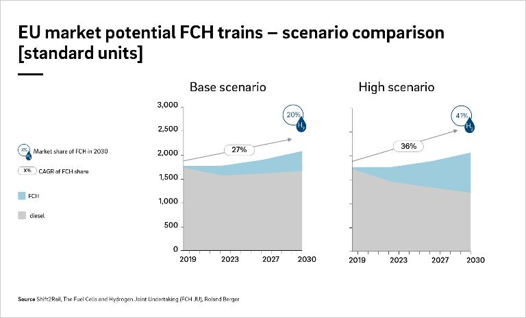 "FCH-powered multiple units could replace 30 percent of diesel volumes by 2030. In other words, one in five currently diesel-powered train vehicles could be powered by hydrogen."