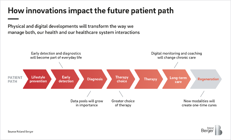 Four key factors drive this new dimension of change. First, breakthroughs in technology are revolutionizing medical practice before our very eyes, opening up a whole new world of possible therapies, such as mRNA vaccines and CGT ( cell and gene therapy ). Second, the digital world is becoming more mature, with many highly promising new approaches emerging in areas such as early detection, lifestyle change and therapy choice. Third, the physical and digital worlds are coming together and enabling many innovative solutions, as we discuss below. And fourth, the pace of technological developments is increasing, affecting not only digital innovations but also new biological and diagnostic technology, supported by an abundance of available capital.