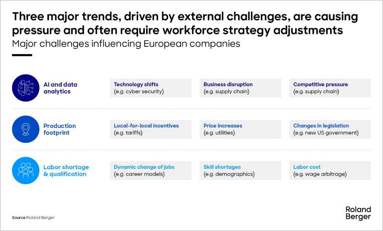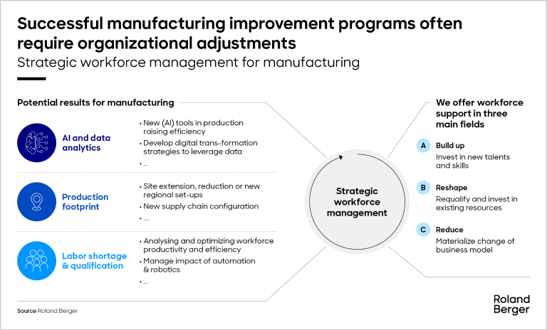 Organizational changes encompass more than just technology and processes; people and skills are also paramount. That's why Roland Berger has developed a unique approach to people management with our Strategic Workforce Management solution. It centers around three key areas: