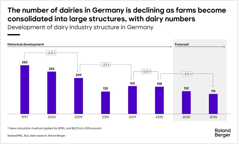 The German dairy industry is consolidating at pace. The number of dairy farms fell from around 94,000 in 2010 to about 50,000 in 2024 – a decline of more than 55% in just 13 years. At the same time, total milk production has remained stable at around 32 million tons. On the processing side, the number of dairies has nearly halved. Landmark mergers, such as the planned tie-up between Arla Foods and DMK to form Europe’s largest dairy cooperative, are emblematic of this dynamic. Our analysis reveals that companies need to be turning over at least EUR 250 m to remain relevant in the food retail sector long term and to have the necessary bargaining power. But size alone is not enough. Equally crucial is to have a clear point of differentiation via a regional background or a unique product offering. Roland Berger helps companies develop and implement growth strategies, identify M&A opportunities, and adopt the right strategic positioning.