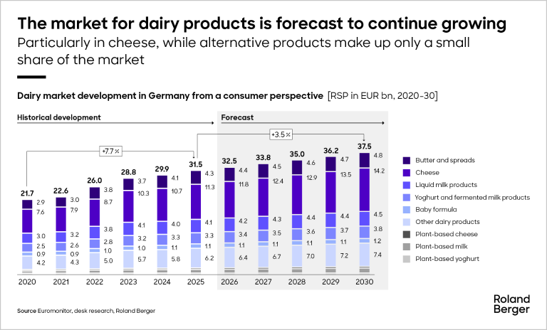 The German dairy industry is undergoing a period of profound change. Alongside the undeniable threats, there are also attractive opportunities – if you are prepared to act decisively now. Successful, future-proof dairy companies build volatility into their strategy, combine critical mass with genuine differentiation, and consistently develop new growth areas. Roland Berger supports companies across the dairy industry with integrated consulting expertise – from strategy and operational transformation to specific digital solutions – and can even provide interim management experts to come in and help deliver sustainable change.