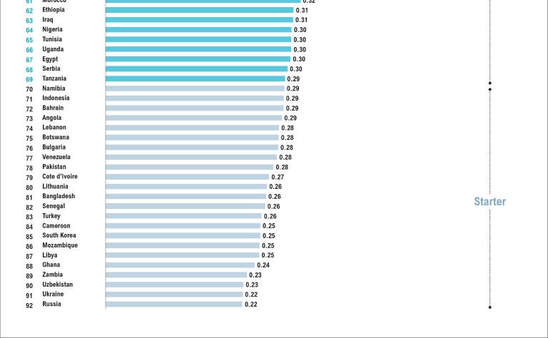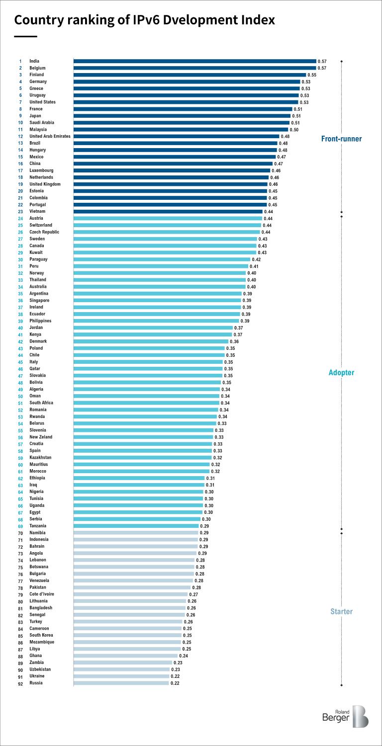 On this basis, we calculated the index for 92 countries and, based on the specific index values, we divided these countries into three categories: frontrunners, accelerators and starters. We performed an in-depth analysis of the development of IPv6 in 3 benchmark countries and 15 countries around the world and puts forward tailored recommendations.