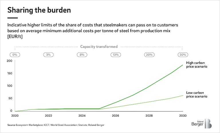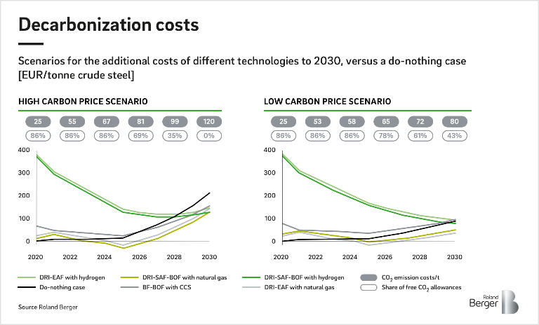 Our modern world runs on steel. But it is a major source of CO2 emissions, second only to the power industry. Currently, the European steel industry – where production is still largely done using coal to reduce iron ore, the so-called “primary route” – accounts for 5.7% of the total EU greenhouse gas (GHG) emissions. To meet emissions targets set by the 2015 Paris Agreement, the steel industry will have to be climate neutral by 2050, and reduce emissions by roughly 30% by 2030 to meet EU interim targets. Achieving these targets will take more than just material or process efficiency. As it stands now, steelmakers have three options: do nothing; invest in carbon capture and storage solutions, or transition to cleaner production processes such as hydrogen direct reduction of iron (DRI). Roland Berger developed a model to assess costs of all three and came to the conclusion that steelmakers should opt for the DRI route in order to meet interim targets. As to who will pay for the green transformation, the report indicates that taxpayers and end customers/consumers will have to bear the brunt of it. Additionally, it will require public capital expenditure (CAPEX) funding in the double-digit billion range.