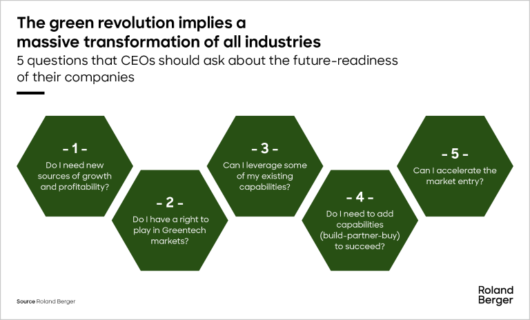From energy generation and sustainable mobility to the circular economy – greentech is growing fast. Currently worth around EUR 5 trillion, the global market is expected to reach EUR 12 trillion by 2030. Greentech encompasses more than 100 types of technology, including green hydrogen, energy-efficient lighting and photovoltaics. It is a highly attractive area for any company that provides machinery or other industrial products and services. Navigating the myriad options within greentech can be challenging, but Roland Berger can help businesses identify new opportunities amid the complexity.