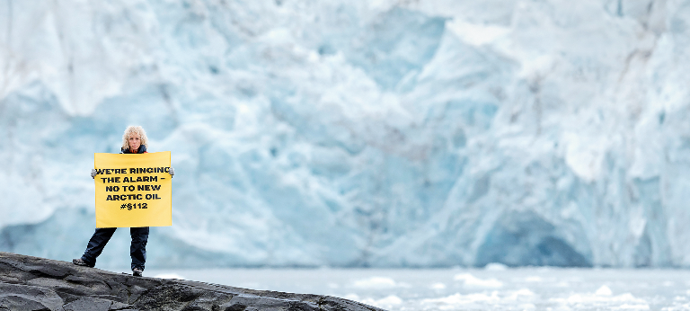 Jennifer Morgan, pictured above at a glacier in Svalbard shortly after joining Greenpeace International in 2016, is raising awareness of the impact of Arctic oil drilling.