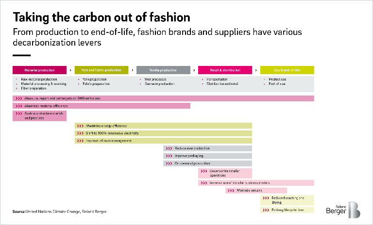 Then comes decarbonization itself. Various climate action levers are available to fashion brands and suppliers. A key first step is to set up a system to define and measure GHG reduction targets. Next, fashion companies need to take action to reduce GHG emissions. They can do this by, for example, implementing programs aimed at boosting energy efficiency and the use of renewable electricity among suppliers and limiting overproduction. Not to forget the end-of-life use, for which clothing brands need to enable a circular fashion approach, with more materials to reuse and recycle.