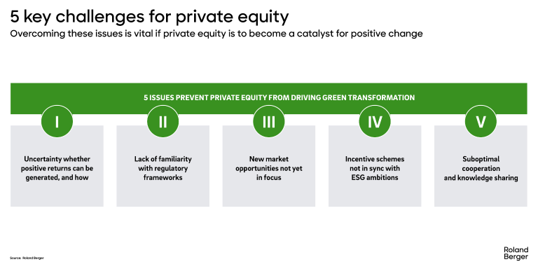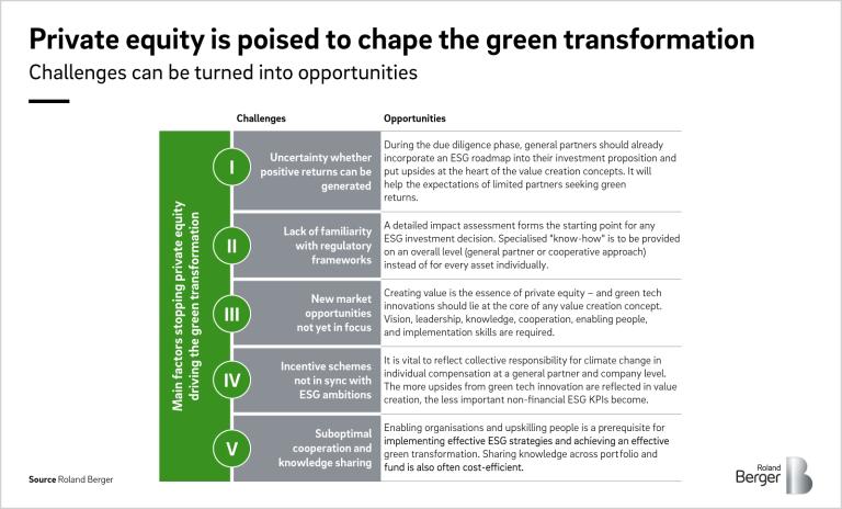 For decades, the private equity industry has driven corporate transformations. Now, it is poised to assume a significant role in transforming companies from gray to green. Thanks to their mid to long-term investment horizon, general partners are in a unique positioned to act as a driving force for carbon neutrality and meet society’s collective responsibility towards future generations. We have examined in detail at the five key factors currently hindering private equity from playing a more significant role in green transformation. We are convinced that by actively addressing those challenges with value creation concepts, companies can turn them into opportunities – with the help of the strategies outlined here.