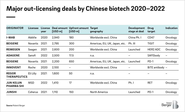 Since then, the number of deals from Chinese biopharma to international players has increased significantly. In 2021, more than 50 deals were signed, valued at over USD 14 bn. Those were mostly signed by global mega pharma such as Novartis, Sano, and Roche. China is now seen as one of the key sources of innovation in the pharmaceutical industry.