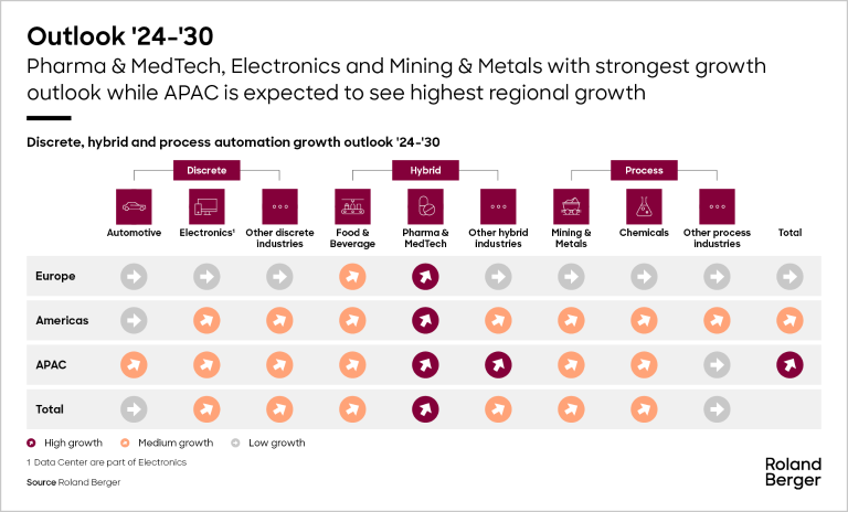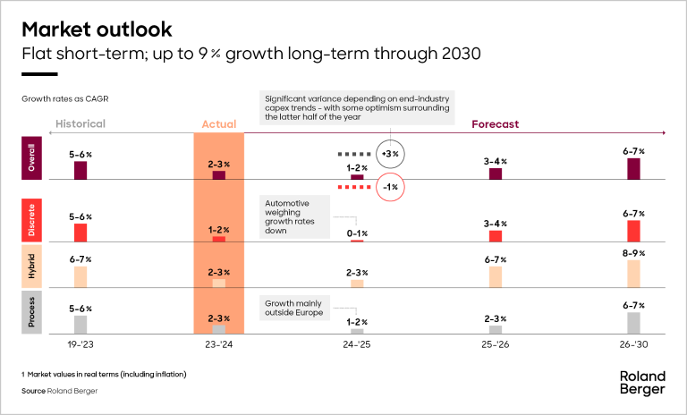 Beyond 2025, the outlook for growth is positive across virtually all segments of industrial automation through the end of the decade. The pharmaceutical and MedTech industries will lead the way together with Battery/ex-EV followed by food & beverage, electronics (including data centers) and the mining and metals sector. With the exception of automotive engineering and certain process industries, the current lull should be short-lived, followed by moderate to strong growth between 2026 and 2030.