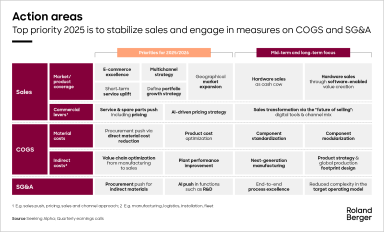As growth remains meager through the end of 2025, the first priority should be to stabilize sales by optimizing sales strategies, delivering excellence in e-commerce in particular and, where possible, preparing the ground for geographical market expansion. At the same time, short-term commercial levers such as the sale of services and spare parts must be activated. In addition, it is important to flesh out an AI-driven pricing strategy.