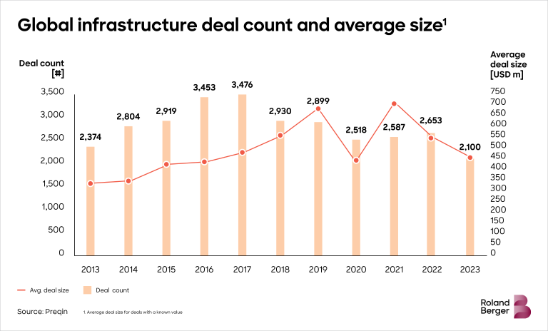 Macro headwinds that started blowing in 2022 continued well into 2023 significantly affecting infrastructure M&A activity. In 2023, global infrastructure M&A deal count declined 21 % y-o-y, while average deal size dropped 16 %. This decline is stronger than what most respondents of our Infrastructure Investment Outlook 2023 survey expected as of Jan 2023. Worsening macroeconomic situation as the year 2023 progressed was the reason. It is also the first time since 2013 that average deal size declined for two years in a row (2022 and 2023).