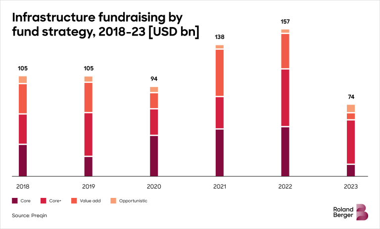 The most pronounced impact of the slowdown has been on new capital. Infrastructure fundraising declined by >50 % in 2023 from its 2022 peak of USD 157 bn. Fundraising for the Core strategy experienced the steepest decline, while that for the opportunistic strategy doubled, albeit from a small base. Allocation to the Core+ strategy declined in 2023 y-o-y, but remains significantly above historical levels. Since 2018, the share of North America in global fundraising has grown significantly, especially for the Core+ strategy.