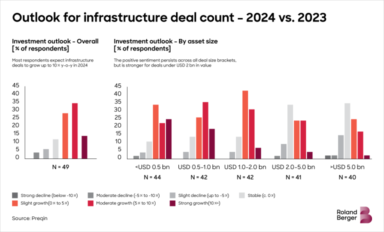 To gauge investors’ expectations for infrastructure investments in 2024, we surveyed experienced investment bankers and fund managers. 60 % of the respondents expect infrastructure deal count in 2024 to grow slightly or moderately over 2023, while 14 % expect it to grow strongly. This sentiment is the strongest for deals below USD 2 bn in size. The outlook for larger deals is less optimistic but has improved when compared to that from our 2023 survey results.