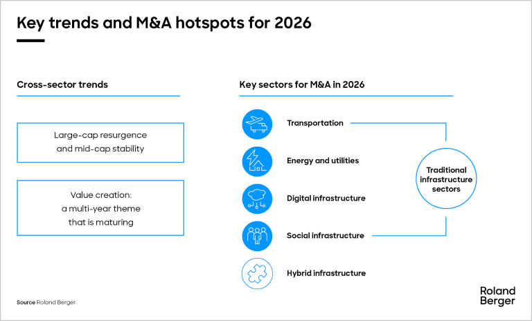 Discussions with market participants, projects and internal analysis led us to examine two major trends as we look ahead to 2026 and beyond: revived activity around large-cap transactions and a continued increase in emphasis on value creation . Notably, both developments are influencing the infrastructure investment landscape across multiple sectors.