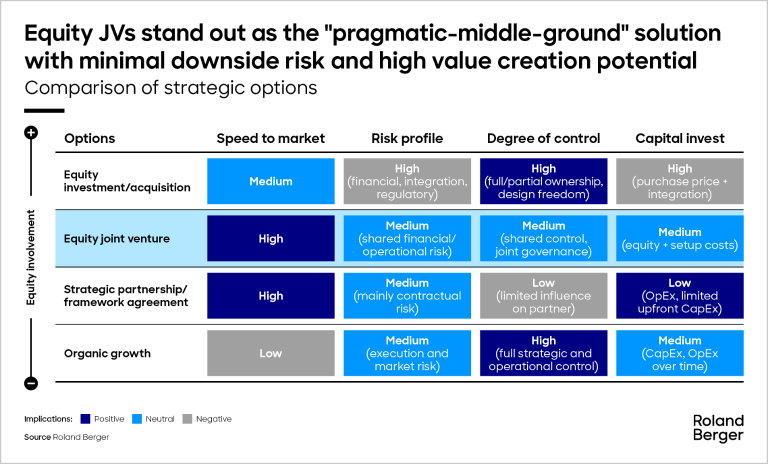 JVs have four main competitive advantages. First, they can provide access to the new capabilities demanded by disruptive developments such as AI and decarbonization. Second, they help to spread risk. Third, they enable faster scaling through combined capabilities, coordinated market rollouts and aligned product roadmaps. Lastly, they extend product reach as each partner brings in new channels, relationships and regulatory expertise.