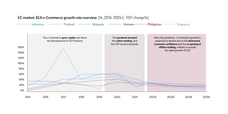 1. E-commerce has been a significant contributor to the growth of the CEP market. However, concerns have arisen among players regarding the anticipated growth rate, following a period of rapid expansion and overheating. Despite experiencing a remarkable growth rate of up to 70% p.a. during the COVID pandemic, e-commerce growth is expected to decelerate due to the recovery of offline markets in Southeast Asia since 2022.