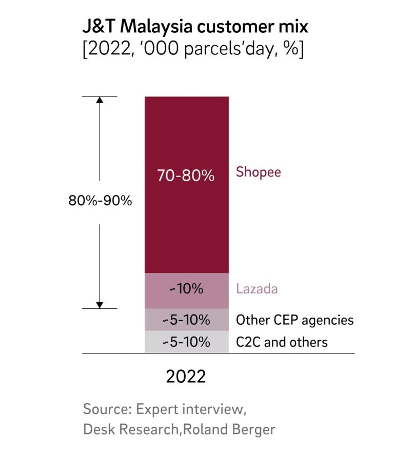 2. Shopee and Lazada, which are the primary e-commerce platforms in Southeast Asia, have gained considerable leverage due to their dominant position in almost all markets. They have formed partnerships with various players for regular delivery services, while a limited number of specialized providers cater to the same-day and instant delivery segments. Furthermore, they have strengthened their bargaining power in vendor pool selection and order allocation, and have also switched to in-house logistics to ensure better delivery and customer experience. For instance, Shopee and Lazada have expanded their logistics capabilities with Shopee Express and Lazada Express, respectively. Consequently, CEP players heavily rely on these e-commerce platforms, making them susceptible to rising price pressure. For instance, in Malaysia, J&T Malaysia earns up to 80% of its revenue through its association with Shopee.