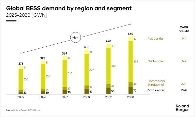 Among stationary storge applications, data center has emerged as the second largest stationary market for batteries globally. At Roland Berger, we expect that data center demand for batteries will grow from ~20 GWh globally today to over ~70 GWh of demand by 2030. This ~26% growth rate is among the highest of battery segments and is the reason why this has become an important growth vector (and margin drivers) for players in the battery value chain looking to wait out electric vehicle (EV) winter .