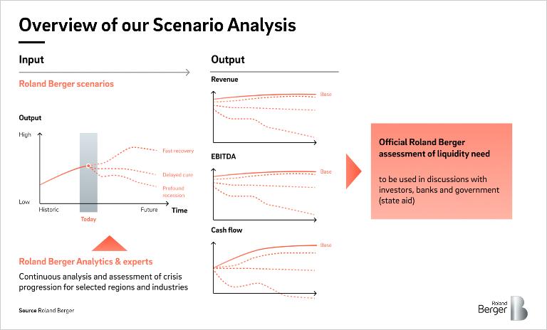 Our experts will assess external and internal factors, run through scenarios and derive the resulting liquidity need as well as financing possibilities.The scenarios we develop will take account of the latest knowledge on the impacts of the coronavirus crisis in the respective industry and regions relevant to your company. This is based on the Roland Berger Analytics team's regularly updated analysis of the economic impact of Covid-19 on a region-by-region and industry-by-industry basis.