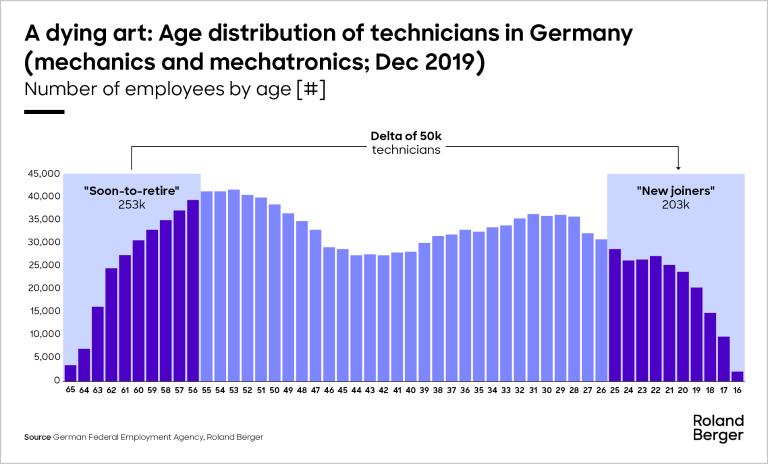 But attracting and retaining skilled employees is an increasingly difficult task. Demographic trends, coupled with changes in work and travel preferences and increasing requirements for digital skillsets, have created a perfect storm. The data reflects this: The number of job openings at German mechanical engineering companies has increased by over 150% in the past ten years. This equates to an annual growth in open positions of 10%, a significant upwards trend. Indeed, our analysis shows a shortfall of at least 50,000 technicians in mechanics and mechatronics that is likely to emerge over the coming decade.