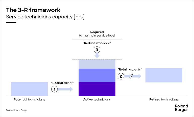 To address these worrying workforce trends, companies must act now to ensure the future success of their service businesses. Organizations must become more proactive in Recruiting, reinventing the service technician job and turning it into a desirable choice for young talent. They need to get creative to Retain their existing base of experienced and highly skilled technicians, preventing them from leaving field service teams. And they need to Reduce the technician capacity required to support their targeted service levels and business growth.