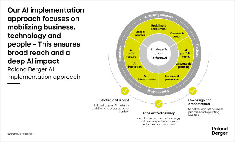 Delivering meaningful value from AI requires a structured approach that is still flexible enough to be adapted to each company’s needs. The first step is to quickly assess and prioritize use cases, supported by fast evaluation of external solutions. Lean operating models with well-integrated processes help secure early returns, backed by clear financial targets and decision frameworks that keep initiatives on track. Companies also need to unlock existing talent and enable teams to work across functions, while ensuring legal, regulatory and IT partners stay closely involved. Roland Berger’s Perform.AI approach brings these elements together – mobilizing business, technology and people through a tailored blueprint and coordinated implementation.