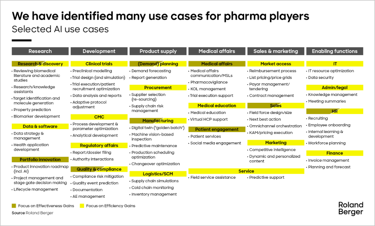 Roland Berger’s uniquely effective support combines strategic insight with strong technical capabilities and an extensive partner network. We assist companies across the pharmaceutical industry, guiding them through AI transformation and helping them choose relevant use cases. Our job? To shape the changes that organizations really need.