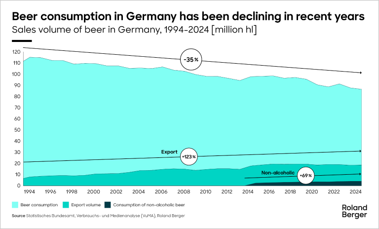 Beer consumption is declining worldwide. The fall is especially dramatic in Germany, where consumption of beer has decreased by 35% in the past 31 years. The main drivers of this trend are a more critical attitude towards alcohol consumption among the population in general, stronger health awareness , and the changing drinking habits of younger generations, which have shifted consumer preferences: People are drinking less classic beer and more non-alcoholic beer as well as beer mixes. But the growing market share of these beverages is not enough to stem the overall decline in volumes sold.
