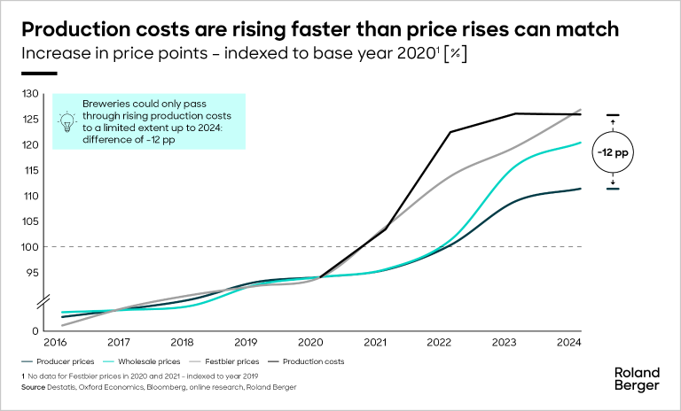 Roland Berger's price and cost radar for the German beer market illustrates the extent of the pressure the German beer industry is under owing to a critical combination of shrinking sales and significantly increased production costs. Particularly the small and medium-sized breweries face substantial and growing pressure on their performance, as costs have risen faster in recent years than prices in retail could match. Even the price rises announced for the coming months will only partially close the gap, making further action unavoidable. Additionally, breweries must develop and implement efficiency-increasing measures and adapt their overall strategy and product portfolio to the new market situation and changes in consumer demand.