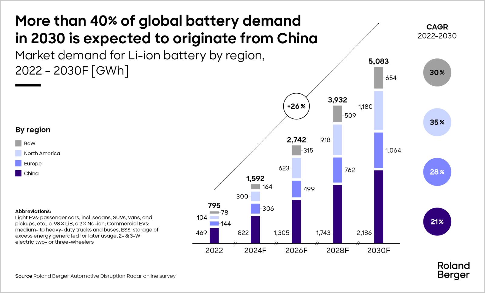 The main driver for these increases is demand for batteries, particularly lithium-ion (Li-ion) cells for EVs and energy storage systems (ESS). From a base of around 795 GWh in 2022, we estimate that market demand for Li-ion and sodium-ion (Na-ion) batteries will soar to almost 5,000 GWh in 2030. China is set to remain the biggest market, and EVs the largest customer. ESS is expected to be the strongest growing segment, with a CAGR of 33%.