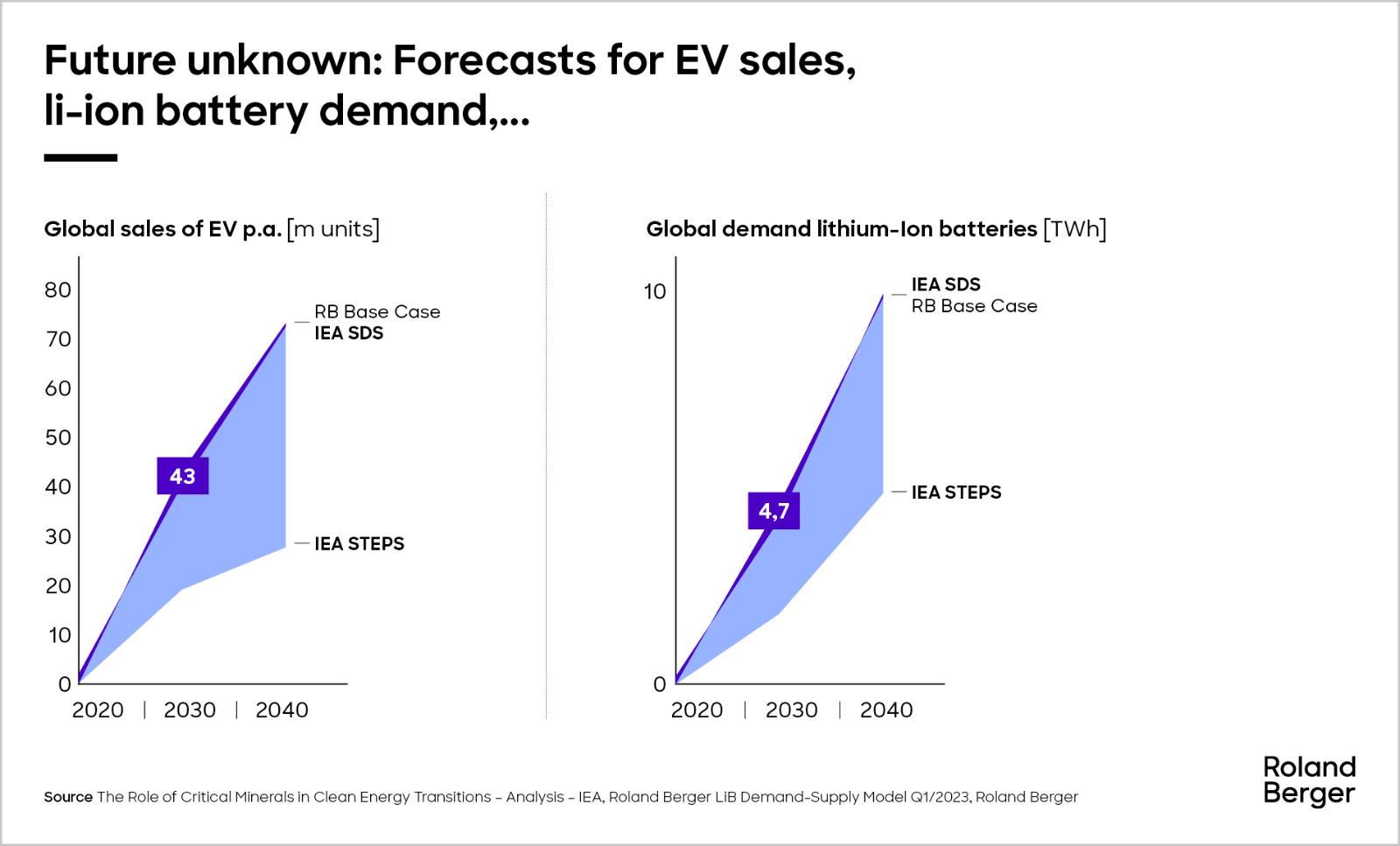 These supply concerns are compounded by significant uncertainties affecting the entire supply chain of critical materials. Several factors stand out. First, uncertainty over EV sales has a significant impact on demand for batteries, cathode and raw materials, and investments – estimates for total investments required by 2040 for lithium, nickel and cobalt mining and refining, and production of cathode active materials, vary by tens of billions of US dollars, for instance.