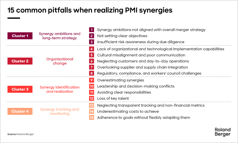 Tracking and monitoring synergies is vital for assessing the progress and value creation of PMI activities. A frequent pitfall here is neglecting transparent tracking and non-financial metrics (including KPIs that offer insights into market perception, customer satisfaction and employee engagement post-merger). Companies must also be careful not to underestimate the costs of integration – including "soft" costs such as loss of morale and momentum. Here, business leaders must find the right balance between lean integration management and comprehensive steering. Finally, organizations can fall into the trap of adhering to goals without flexibly adapting them. The solution lies partly in conducting a thorough evaluation after the integration and establishing regular review mechanisms to assess progress.