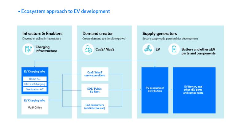 Three building blocks are essential for EV to work in the nascent market environment. These are demand creator, supply securer and enabling infrastructure.