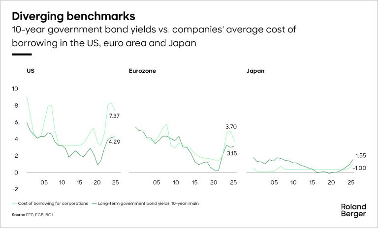 As a result, expectations of deep interest-rate cuts by the Federal Reserve and other major central banks are beginning to fade. Bond markets are even starting to price in rate hikes for 2026. For corporate borrowers, this presents a particular challenge. Financing conditions remain closely tied to 10-year sovereign bond yields. In other words, if government bond yields rise, corporate borrowing costs will follow - often by more.