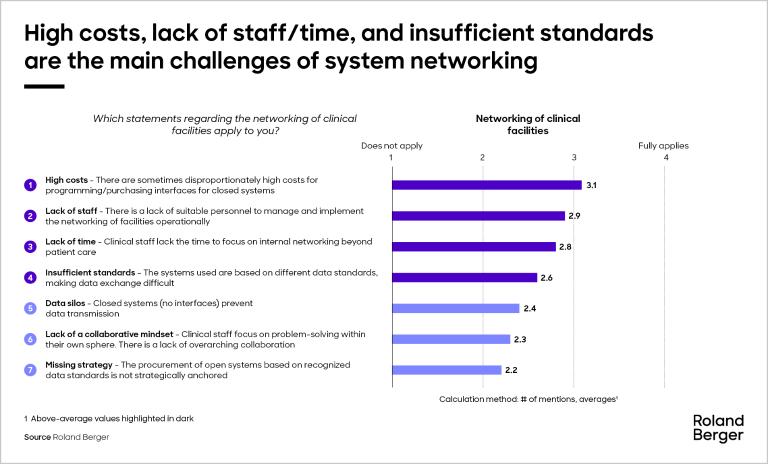 The hospitals surveyed cited high costs for programming and procuring interfaces as one of the biggest challenges when networking systems and clinical facilities internally. Because many providers continue to use proprietary standards, interfaces either have to be purchased at great expense or programmed by third parties. Overall, a lack of standards - in addition to a lack of personnel and time - are cited as the causes of incomplete networking.