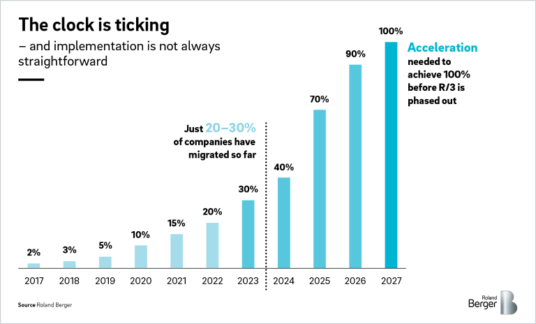 To date, 20 to 30 percent of companies have migrated to the new ERP system. But the clock is now well and truly ticking, with support for the earlier system SAP R/3 ending in 2027. Companies that have not yet made the change will have to transform before this date. This implies a significant acceleration in the rate of companies undergoing transformation.