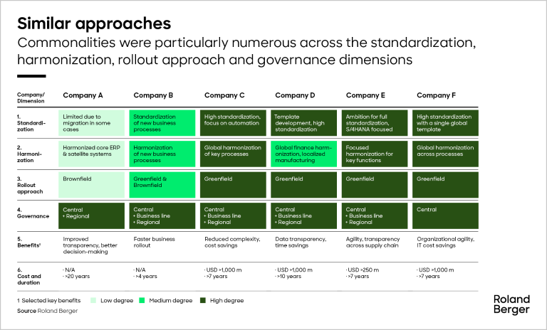 Responses were assessed across six dimensions: standardization; harmonization; rollout approach; governance; benefits; and cost & duration. A significant level of commonality was found within each. For example, decentralized companies are putting a particularly strong emphasis on harmonization and standardization as a key component of their transformation, while tending towards a greenfield approach. The findings for each dimension are discussed in depth in the full study.