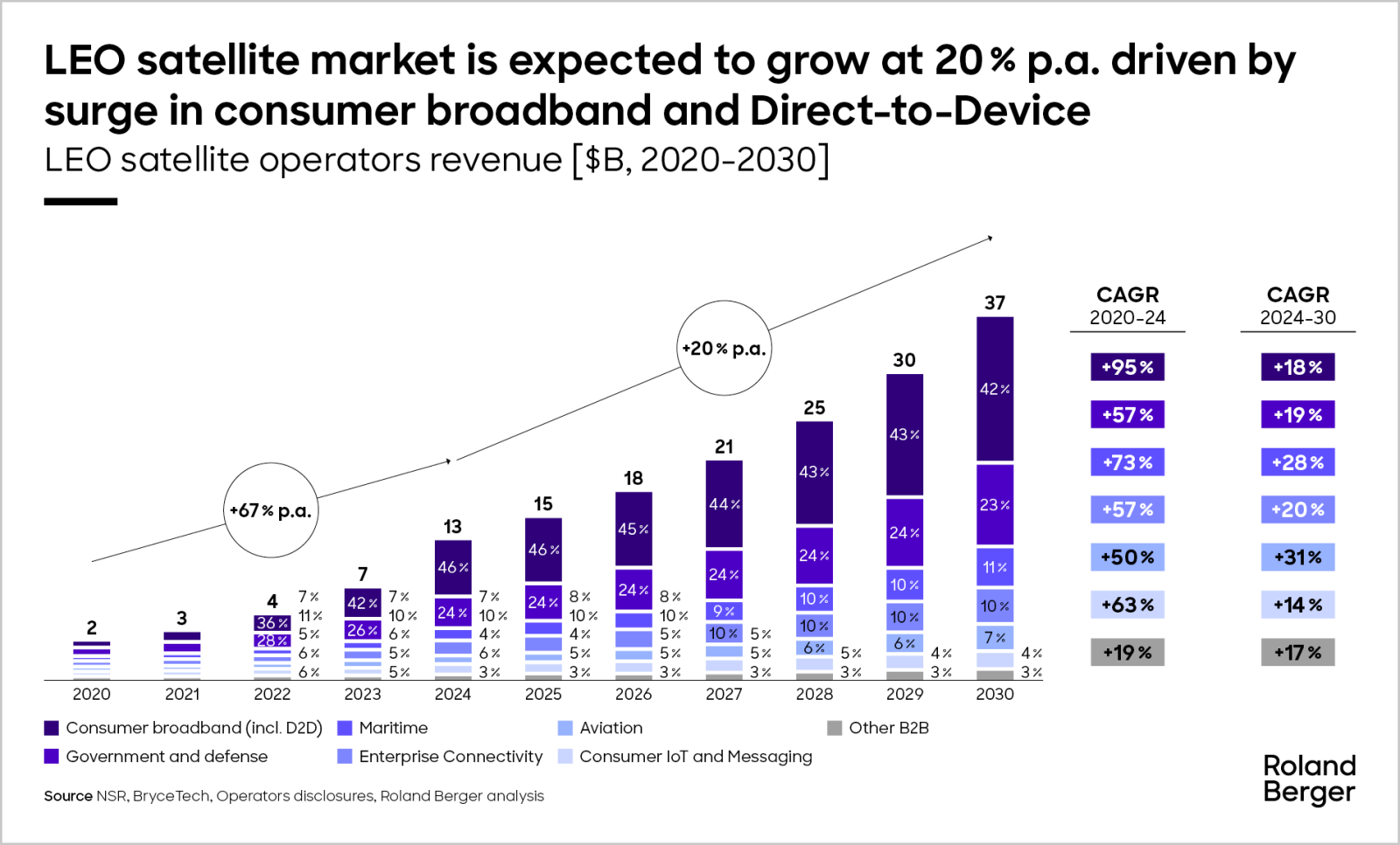 The financial trajectory of LEO satellite services highlights the scale of the coming shift. The LEO satellite operator market is projected to grow at around 20% annually, reaching roughly $53 billion by 2030. Consumer broadband remains the main growth engine, while direct-to-device services are emerging as the next major revenue stream.
