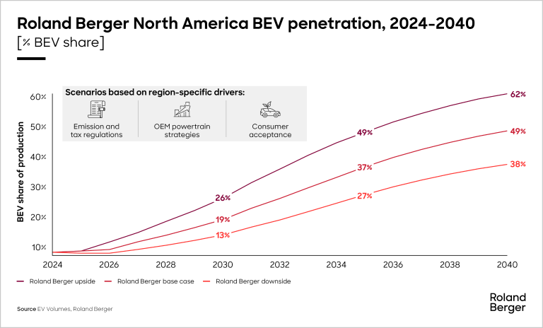 However, the future is still electric and Roland Berger expects North American BEV penetration to reach approximately 50% by 2040 as the North American market benefits from the improved technologies and supply chains developed for BEV demand in other regions.