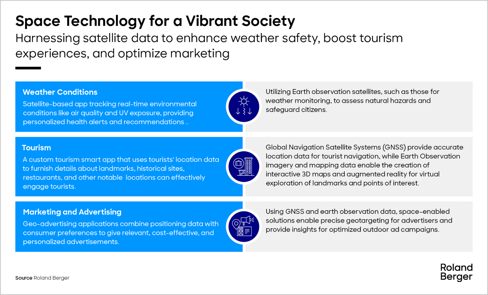 Space-enabled solutions provide significant economic advantages to various sectors and act as a potent booster for organizations that can leverage such technologies to gain a competitive edge. Roland Berger has developed a model that predicts the anticipated demand for space-enabled applications, including Earth Observation and PNT, in 17 distinct industrial sectors. The model also considers the overall future expansion of the SatCom market. This model offers valuable insights into the prospective market size of space-enabled solutions, which have applications across various sectors such as autonomous driving (automotive), real estate monitoring (urban development), tourism, and the enhancement of oil & gas and renewable energy plants.