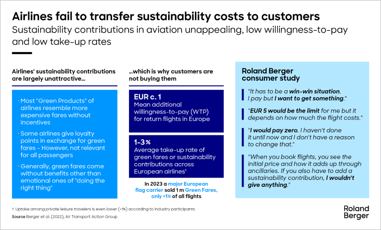 Alternative ways to commercialize sustainability through generally increased prices and fares come at the risk of alienating customers. Due to high competition, especially from low-cost carriers, aviation fares have been exhibiting increasing price elasticities over recent decades. With air travel evolving into a mass-market commodity, airlines’ ability to increase prices beyond competitive price benchmarks is limited to mitigate the impact of growing sustainability costs, resulting in a need for alternatives to generate revenue.